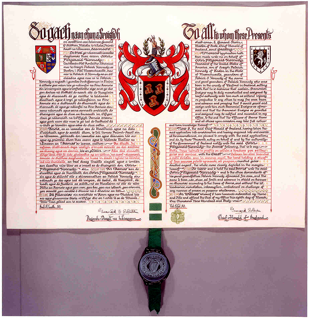 It was only the distinction of the recipient that was unusual about this grant, however. Starting in the early 20th century, Ulster King of Arms, the head of the Irish heraldic establishment under British rule, had begun granting arms to Americans of Irish descent, a practice that was continued following independence by Ulster’s successor in function, the Chief Herald of Ireland. Thus it was on the basis of President Kennedy’s descent from Patrick Kennedy, who emigrated from County Wexford to Boston in 1845, that an application for a grant of arms was lodged on his behalf and subsequently approved.
