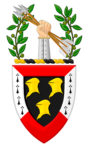 Crest: Between two olive branches a cubit sinister arm in armor erect, the hand holding a sheaf of four arrows, points upward, all proper.